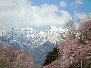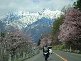 山+雪+桜+バイク