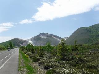 硫黄山が見える道路は、鬼押し出し園みたいな地面に