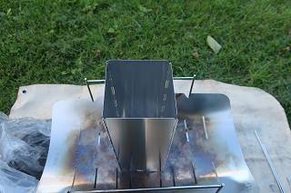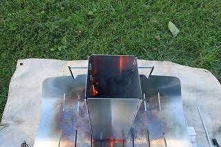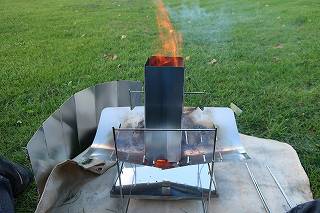 風よけを4枚繋いだ煙突をかぶせて